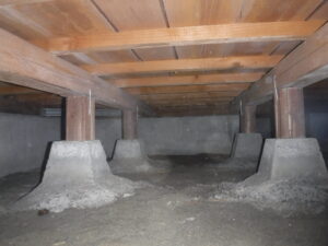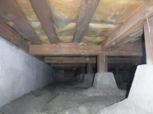 床下の断熱材を確認してみると、やはり和室は無断熱で、断熱材が入っているところでも、たわみがあり脱落しそうな場所が多く確認できました。