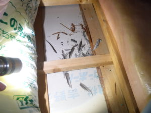 天井裏を確認するとネズミの痕跡だけではなく、スズメバチの巣や鳥の羽なども確認できました。