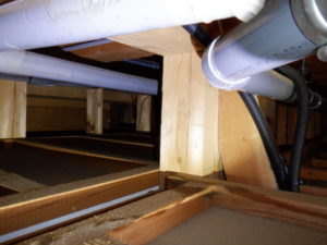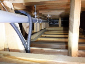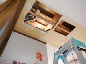 「1階リビングの一部天井より水漏れしたので原因を調べて欲しい」とのことで診断の依頼受けました。                            しかし今回の依頼までは                                                 ①水漏れは2020年11月に発生して建築した工務店に修繕を依頼。                            ②工務店が手配した水道業者に来てもらいリビングの水漏れした部分の天井を一部剥がしたところ、100ℓ位の水が流れ落ち床が水浸し。すぐに原因を調べてくれましたが結果は「水漏れが発生した箇所の2階に洗面台があるが、配管や水道メーターをしらべたが給水も漏れはなく原因不明」とのことだった。                                                             ③しかし工務店は「水漏れが発生した箇所の2階部分の洗面台からの給水漏れしか考えられない」と洗面台の交換と給水管の取り換えを勧められる。                                                             ④これにはⅠ様は納得いかず、2階の洗面台は10年以上も使用していないし水道業者が異常無しと言っているのにおかしいと思い、天井の一部を剥がしたまま1年位自ら原因を考える。                                                                          ⑤2020年2月に工務店に外壁塗装の工事をしてもらった際の高圧洗浄が原因では?と思い込む。                                          ⑥弁護士に相談したところ第3者に診断を依頼するといいとアドバイスを頂く。                                        との事でした。                                                               天井裏、小屋裏、室内、外周と考えられる原因を色々と調べましたが、やはり工務店が手配した水道業者の言う通り異常は無く原因は不明のミステリー案件でした。