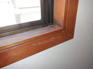 写真は羽アリの舞った窓枠ですが、窓枠下部に横に白く伸びて見えるものがシロアリの食害跡です。