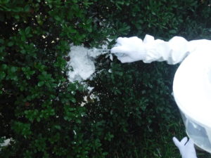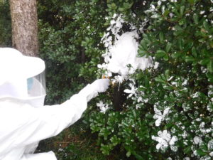 今回の巣は低い垣根にあり駆除はしやすいものでしたが、防護服を着ていても危険であることや近隣の人に危害があってはいけないので巣の出入り口をムース状の薬剤で塞ぎ飛び立飛び立てない方法で対処しました。