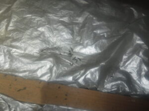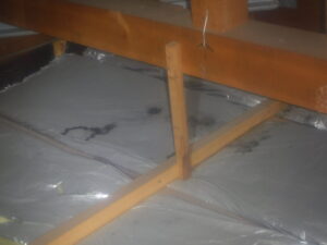 屋根裏で物音がするとのことで状況を確認すると、断熱材の上に広い範囲にフンがあり、その形状から物音の犯人はネズミであることが分かりました。