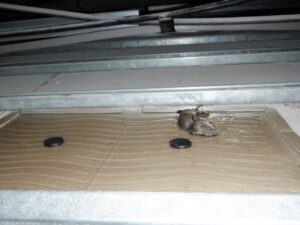 今回の点検では、これまでに一度も痕跡を確認したことがありませんでしたが、天井の点検口を開けようと脚立を上ると死臭が感じられ中を確認してみると粘着板に一匹の鼠が捕まっていました。
