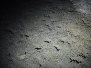 天井裏を確認してみましたが侵入口になりそうな隙間や糞などの証跡は確認できませんでしたが、床下を確認すると足跡があり外部から侵入できそうな隙間もありました。