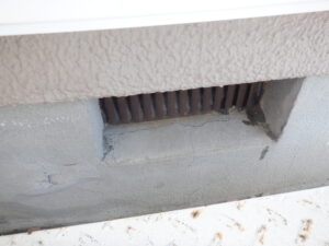 建物外周を点検していると基礎表面の化粧モルタルがポロポロと剥がれ落ちているのが確認されました。