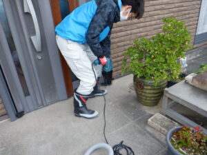 建物の構造上床下へ薬剤を散布する処理が出来ないことから、外周土壌に薬剤を穿孔注入する工法を採用しました。