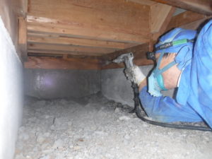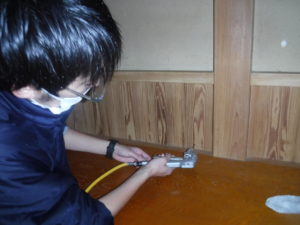 写真は木材に白アリ駆除剤を注入している様子です。