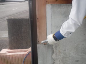 車庫の中には、熱帯魚の大きな水槽があるため噴霧器で吹き付けるのではなく、刷毛を使い塗り込むように表面処理をしたり、木材に穴をあけて注入する方法で薬剤が飛散しないように対応をしました。