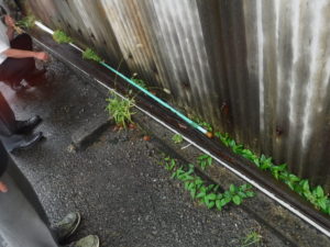 建物内は土間になっており床下が無く壁にはボードが張ってあるため被害状況をしっかりと確認するためにはボードを剥がす必要があることを伝えましたが、現段階では壁を剥がすまではしたくないとの大家様の御意向もあり、壁を剥がさずに薬剤を注入する処理をすることになりました。
