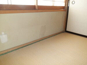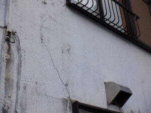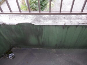 不動産業者様は、既にこの物件には雨漏れがある事は承知していて、建物南面の外壁材表面にひび割れや欠損・変退色などがあり、バルコニーには笠木のひび割れや破断、シート防水の浮き・剥がれなどがあり、また、それらの原因によりで室内の天井や壁表面には雨染み跡が見られる状況でした。