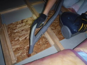断熱材を移動させながら全体的に散在する糞を掃除機で丁寧に除去して、キレイになったところで除菌剤を散布しました。