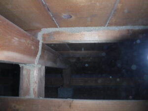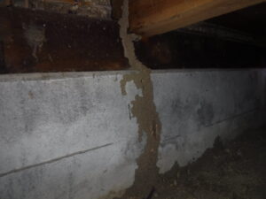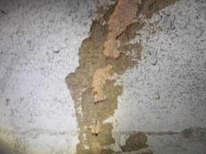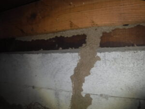 この地域はイエシロアリの生息地域でもあるので、注意して床下など被害状況を確認すると写真にあるように複数個所から侵入の痕跡である蟻道が確認できました。