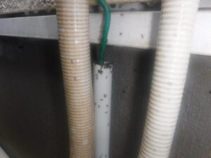 散布中にはあまり活動はみられませんでしたが、エアコン室外機周辺に薬剤散布をしたところ、エアコンのアース線のパイプから大量のクロアリが溢れるように出てきました。
