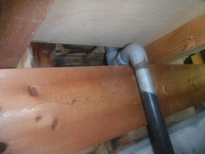 建物点検で床下を点検している時に、床を支えている大引きや根太に水が染みた跡を発見しました。