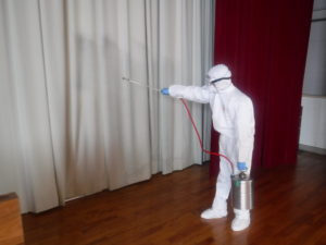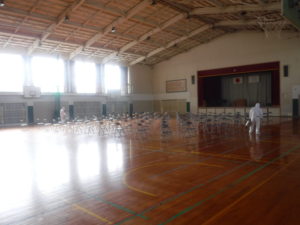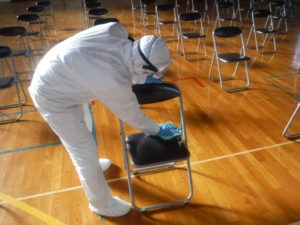 会場は各学校の体育館や施設を利用して行われたため、藤枝市ではそのあとに施設を利用する市民や学生を感染から守るために会場内の除菌対策を計画して万全の体制で執り行われ、その作業に行ってきました。