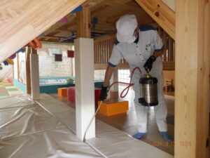 そうした暑さの中、本日は運動教室や室内遊具があり小さな子どもから大人までが存分に体を動かしたりできる施設の害虫防除作業に行ってきました。