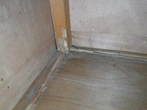物入を見ると写真のように木部に食害が確認され、その跡から白アリによるものと特定できたため床下に入り確認してみると、やはりそこには白アリの特徴ともいえる蟻道がありました。