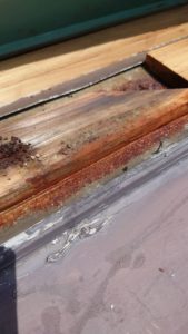 雨漏れは棟板金の経年劣化によるもので、釘の浮きが数箇所あり、釘穴から侵入した雨水が木製の貫板を濡らし腐らせ、徐々に下地を傷みさせた結果、内部に雨漏れへと被害を拡大させていました。