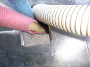 床下からの調査時に配管が齧られていることが確認されていましたが、外からは植木が茂っていて詳細な状況が把握できないことや塞ぐ加工も出来ないことから、本日は部分的に植木を切らせてもらい作業に入らせて頂きました。