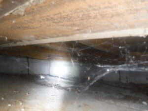 玄関ドア枠に白アリの被害が少し確認できたので床下から被害状況や侵入箇所を調査したところ、玄関付近にある階段下やその周辺に白アリが侵入する際につくる砂を固めたトンネル状の蟻道が何本もありました。