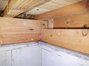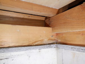 白アリの再発は見られず、調湿材も良好でしたが、浴室部分の土台に水の染み跡が見られました。