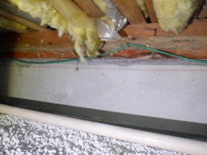 一見僅かな染みあとに見えますが、今までの経験から浴室側からの水が染みて土台の反対側にまで症状がでている場合、浴室側の土台はかなりの腐朽が進んでいることが多いので要注意個所としてお客様にご報告としました。