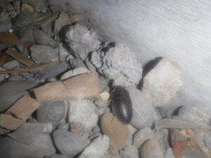 床下の調査中になにやら目の前にモソモソ動く黒いものが・・ライトで照らしてみると、なんとサツマゴキブリがいました!