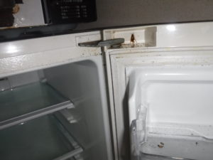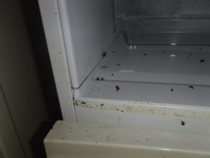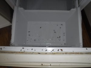 生息場所や個体数などの状況を確認すると主に激しかった場所はキッチンシンクのフレーム周りや引き出しの中、それと冷蔵庫の電源部と扉周りでした。