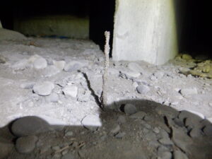 床下の調査をするとシロアリが活発に活動している地盤でよく見られる空中蟻道が広い範囲で多数確認され、基礎から土台へと繫がる蟻道も何本も確認されました。
