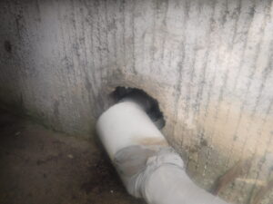 この配線を通すための穴は新築時からあるものではなく、リフォーム工事で空けられたものでしたが、何らかの原因で配管が外れてしまい隙間が出来てしまったものと思われます。