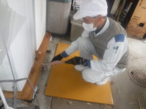 ”害獣などの侵入や何か気になる事はないですか?”とお客様とお話をしながら点検にとりかかると早速、冷蔵庫の下に仕掛けて置いた粘着板に小さなネズミがかかっていました。