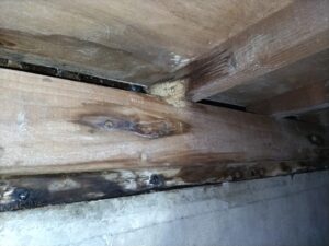 床下の調査で浴室の土台に水漏れと思われる染み跡と腐朽が確認できました。