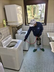 作業では状況を確認して、侵入され易い環境や生息されそうな環境か細部に注意を払い、万が一侵入されても繁殖されないように清掃や予防剤の散布を行います。