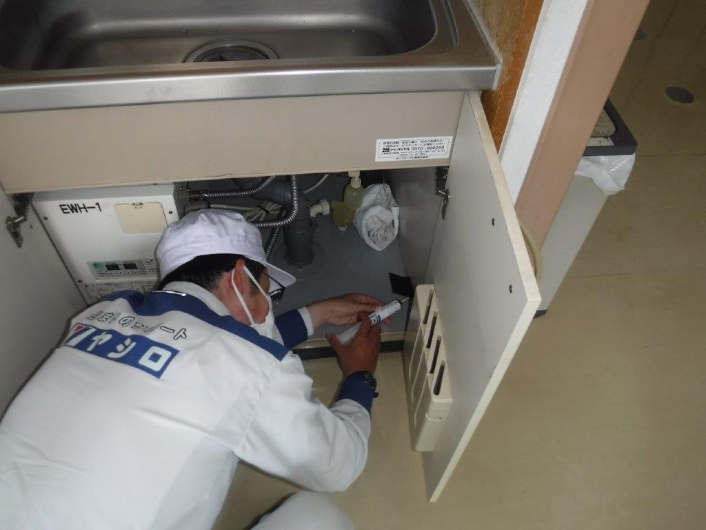 調査用トラップでの捕獲が確認された場合、細いノズルのついたエアゾール剤で付近の生息確認及び駆除処理を行います。